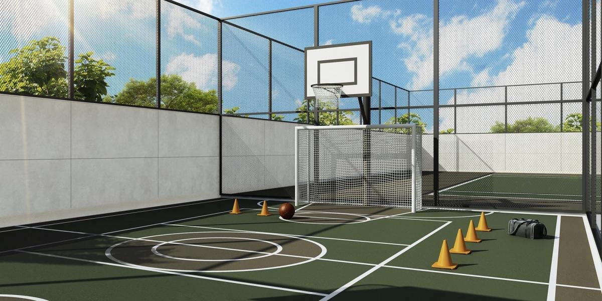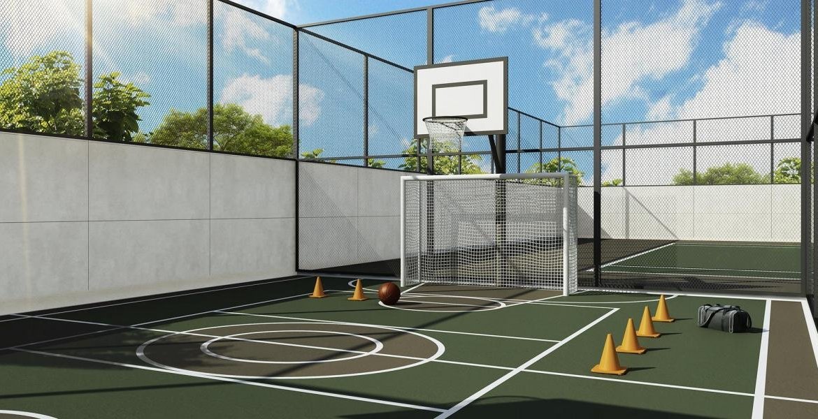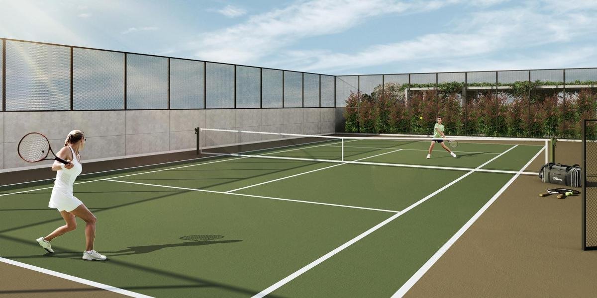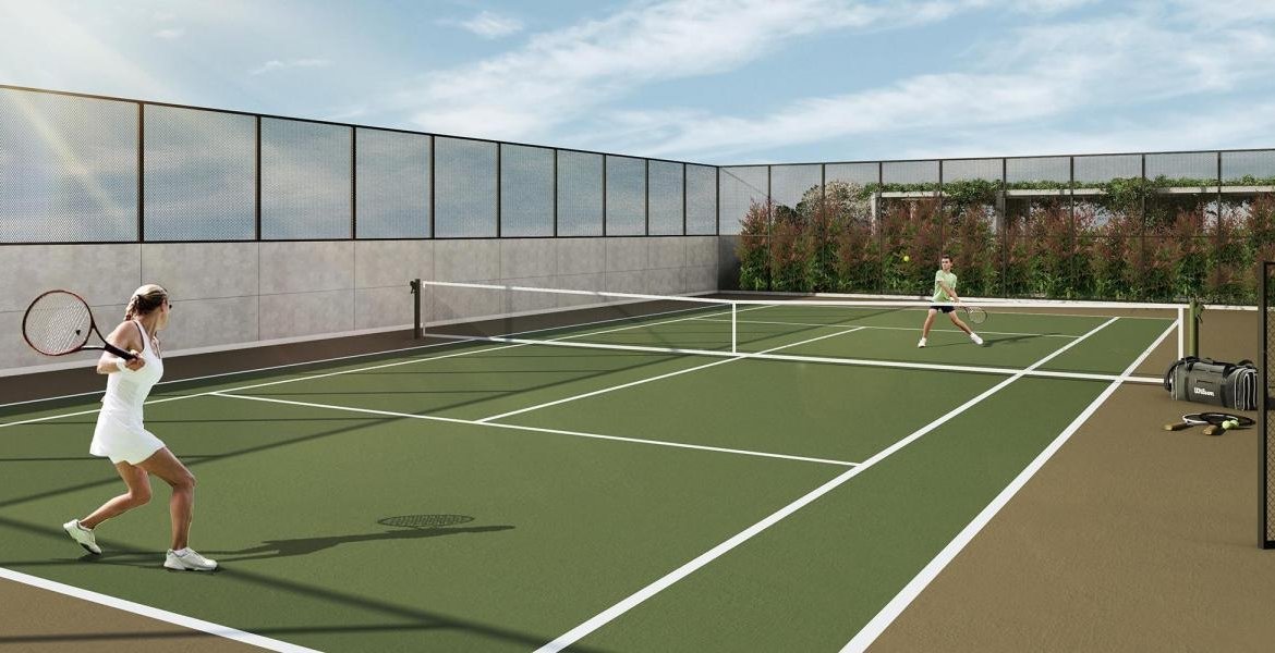 – Quadra de tênis com dimensões oficiais e piso de quadra rápida, que confere flexibilidade e resiliência com camada de alto poder de impacto;