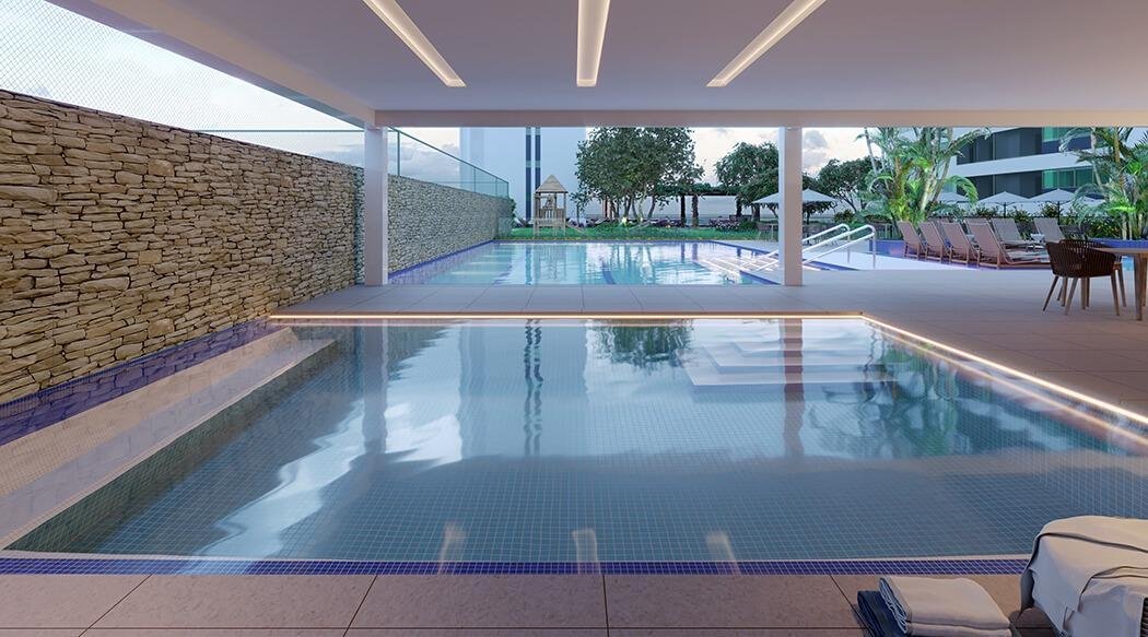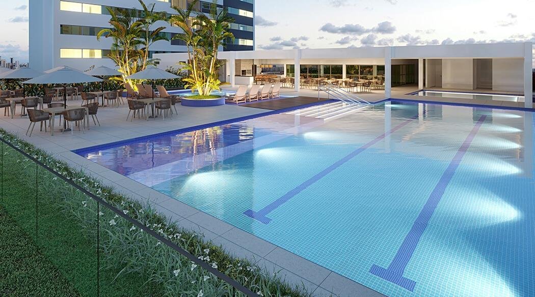 O Mirante do Cais é composto por 2 torres, Mirante Norte e Mirante Sul, ambas compartilhando de uma área de lazer completa, moderna e inovadora. Além dos espaços tradicionais, como piscina, sauna, salão de festas, playgound, brinquedoteca e espaço gourmet, a área de lazer terá quadra de tênis profissional, piscina coberta e aquecida, pista de cooper, horta e pomar orgânicos.