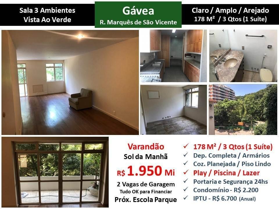 Maravilhoso apartamento claro, amplo e arejado com vista para o verde na Gávea. São 178 m2 com sala em 3 ambientes, varandão, 3 quartos sendo 1 suíte, cozinha planejada e dependência completa. Sol da manhã. 2 vagas de garagem. Prédio com lazer e portaria com segurança 24 horas localizado próximo a Escola Parque.Elt;br> <br><br><br>Chave do anúncio: 9SyNHOUenjM74dzg – 07/06/2021