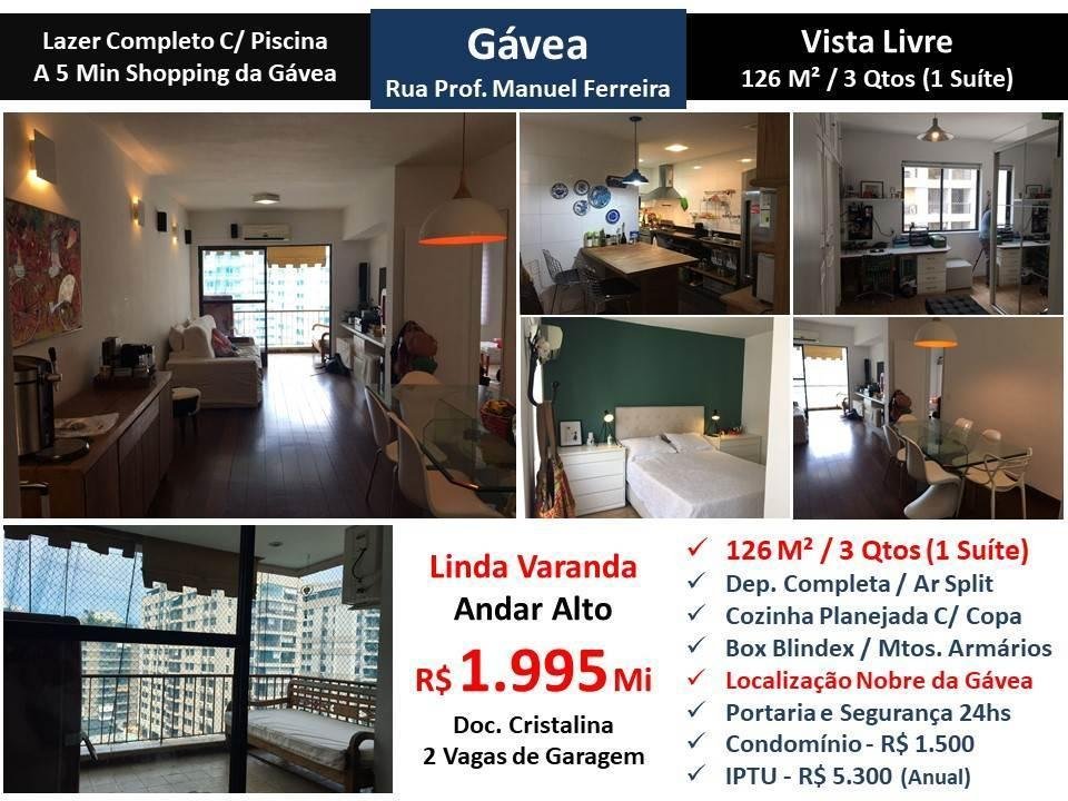 Maravilhoso apartamento em andar alto com vista livre em localização privilegiada na Gávea. São 126 m2 com sala, linda varanda, 3 quartos sendo 1 suíte, cozinha planejada com copa e dependência completa. Muitos armários. 2 vagas de garagem. Prédio com lazer completo e portaria com segurança 24 horas localizado a 5 minutos do Shopping da Gávea.Elt;br> <br><br><br>Chave do anúncio: TttfHrO19HqNzZ2k – 07/06/2021