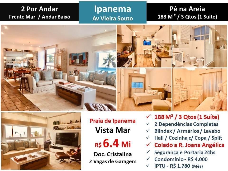 Maravilhoso apartamento de frente em andar baixo com vista mar em frente a praia em Ipanema. São 188 m2 com sala, 3 quartos sendo 1 suíte, lavabo, cozinha com copa e 2 dependências completas. Apenas 2 por andar. 2 vagas de garagem. Prédio colado a Rua Joana Angélica com portaria e segurança 24 horas.Elt;br> <br><br><br>Chave do anúncio: JDovJHmDW7zWJqGf – 02/06/2021