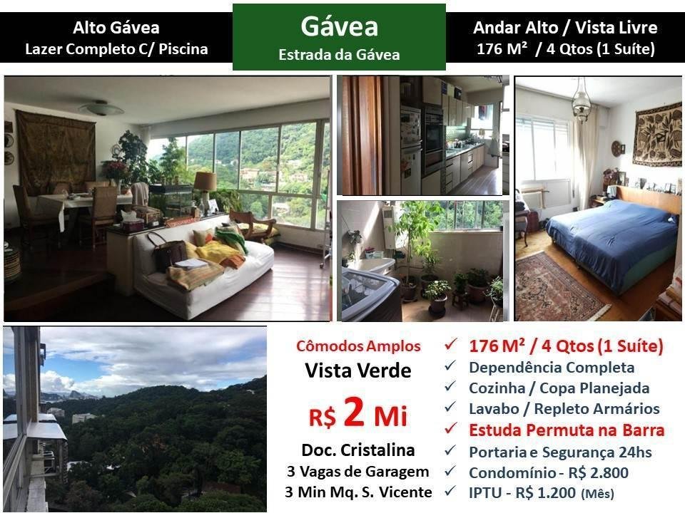 Maravilhoso apartamento em andar alto com cômodos amplos e vista livre para o verde na Gávea. São 176 m2 com sala, 4 quartos sendo 1 suíte, lavabo, cozinha planejada com copa e dependência completa. Piso em tábua corrida. Repleto de armários. 3 vagas de garagem. Prédio com lazer completo e portaria com segurança 24 horas localizado a 3 minutos da Rua Marquês de São Vicente. Estuda permuta na Barra.Elt;br> <br><br><br>Chave do anúncio: 59KmaWegwPFnKO5G – 07/06/2021