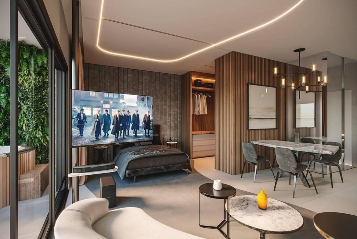 Fechadura eletrônica, sistema multimídia wall, sistema de som embutido, assistente pessoal inteligente e controladora.