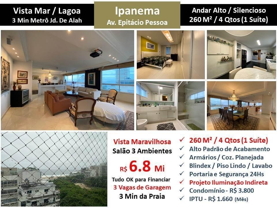 Maravilhoso apartamento em andar alto silencioso com alto padrão de acabamento e com linda vista mar e para a Lagoa em Ipanema. São 260 m2 com salão em 3 ambientes, 4 quartos sendo 1 suíte, lavabo e cozinha planejada. Armários. Projeto de iluminação indireta. 3 vagas de garagem. Prédio com portaria e segurança 24 horas localizado a 3 minutos da praia e a 3 minutos do metrô Jardim de Alah.Elt;br> <br><br><br>Chave do anúncio: MehwHOAzs5kWc8pm – 02/06/2021
