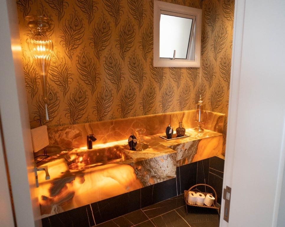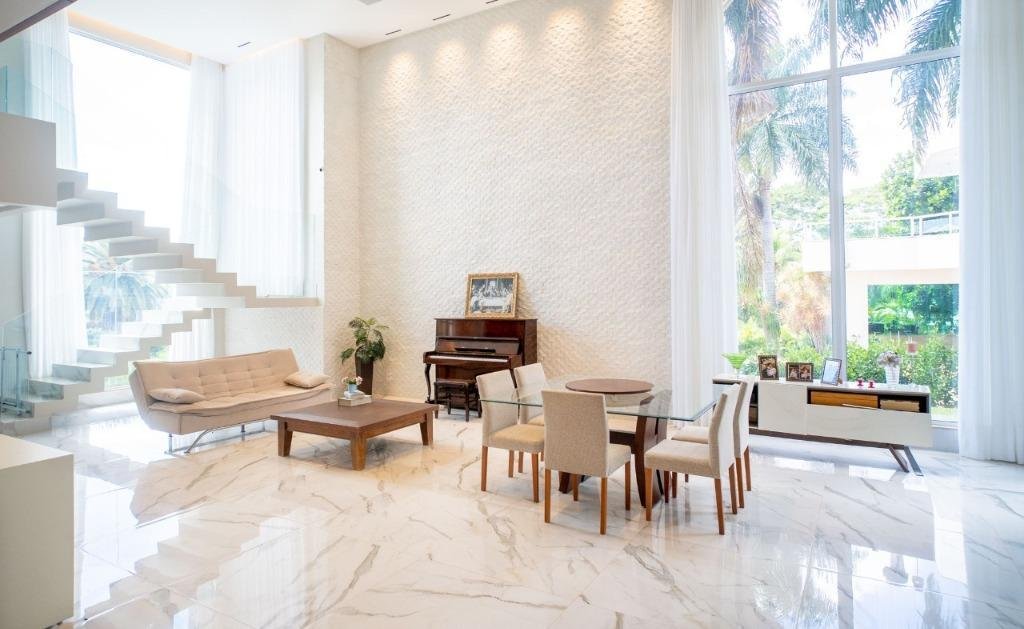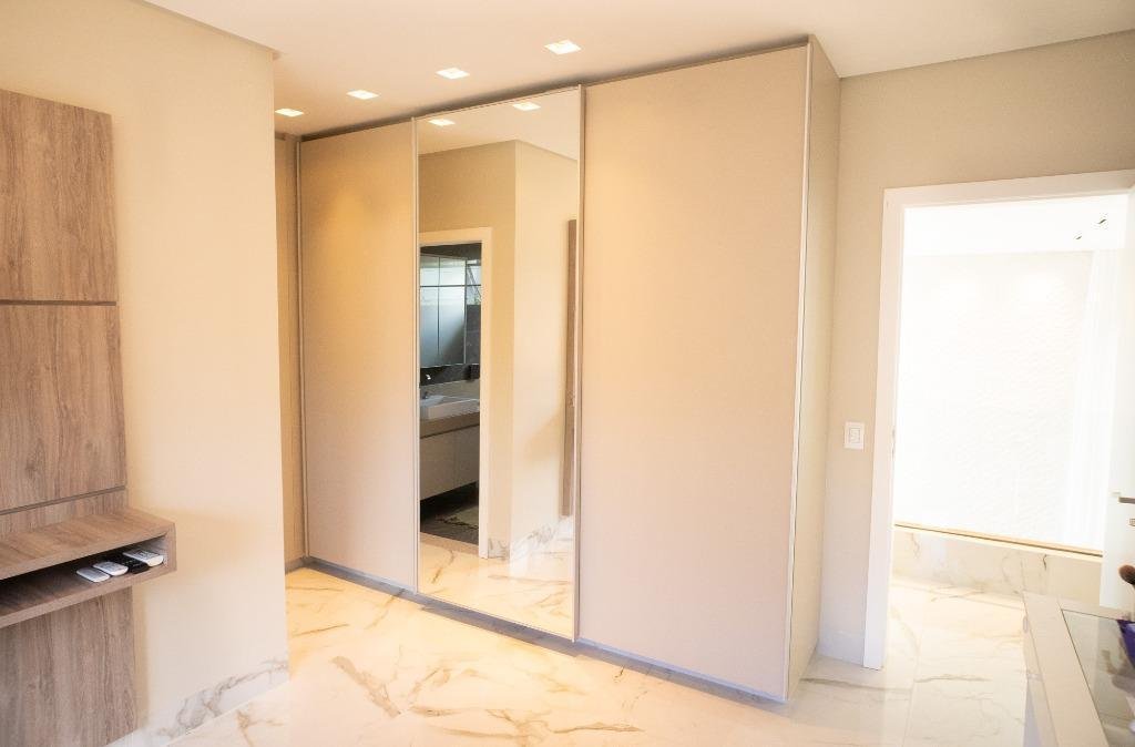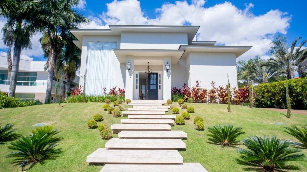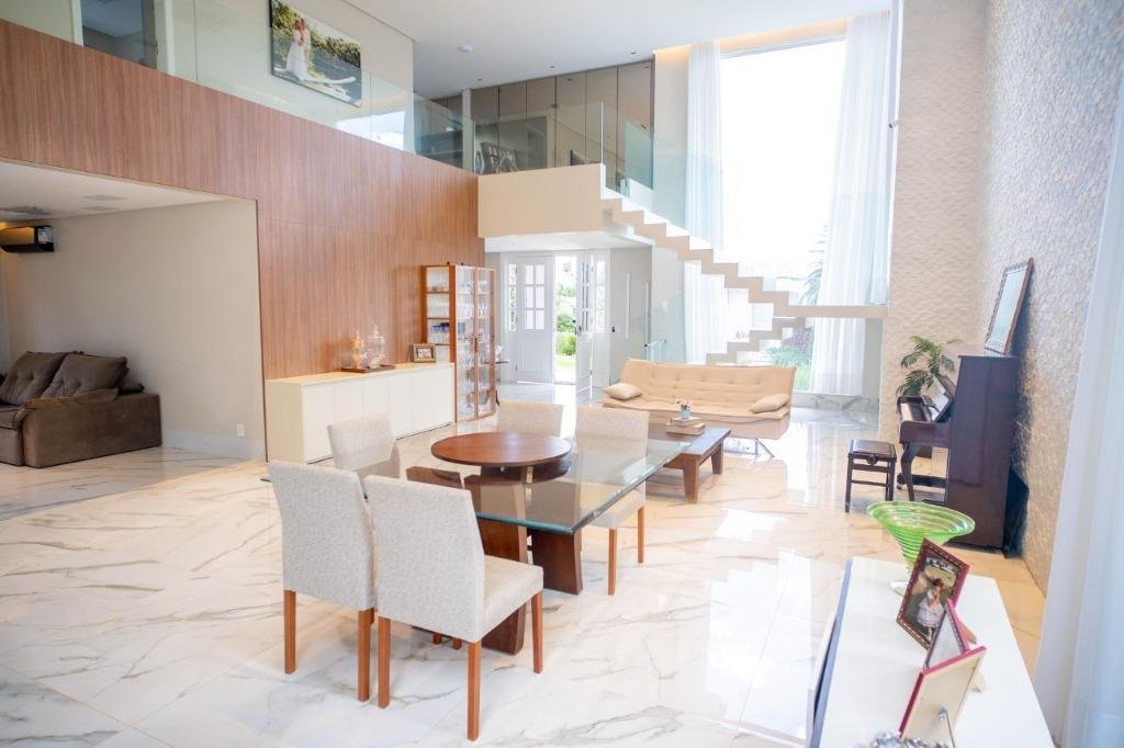 Sobrado Aldeia do Vale Rua dos Barus, Quadra 14 A, Lote 03. Lote: 1.500 m² (25 x 60) Pavimento Térreo: 298,20 m² Pavimento Superior: 160,00 m² Área Total Construída: 458,20 m² Lindo Sobrado no condomínio Aldeia do Vale com Lote de 1.500 m² e 458,20 m² de área total construída. Projeto imponente e bem elaborado pela arquiteta Tereza Cristina, com fachada luxuosa em estilo clássico e muita área verde. Sala de estar e jantar com pé direito duplo integrada com o home cinema e um lavabo maravilhoso. Ampla Varanda Gourmet com + de 60 m² e uma imponente churrasqueira com acesso para cozinha com despensa e uma dependência de empregada completa. Piscina com prainha, SPA com hidromassagem, espaço de descanso com banco e uma jabuticabeira. O pergolado de madeira integra o lazer e a sauna com banheiros masculino e feminino. A garagem para 02 carros esta preservada com acesso lateral e fica ao fundo da casa, próximo a área de churrasco, para ampliar o ambiente em dias de festa. Possui também no Térreo 01 suíte de apoio. 04 suítes no Pavimento Superior, sendo 01 suíte máster com closet e amplo banheiro com hidromassagem + 03 suítes plenas. Circulação ambiente para roupeiro e espaço para instalação de elevador. Diferenciais: Completa em armários (OGGI ambientes); Poço artesiano (8 mil litros de água por hora); Irrigação automatizada (reservatório de 5 mil litros); Cozinha com energia 110 e 220 volts; Varanda gourmet com 8 caixas de som; Luminárias Everglow, com dimerização; Pia da cozinha e varanda gourmet com triturador; Suíte máster com preparo para home theater (caixas no gesso); Lift da TV na varanda e banheiro máster, gira quase 360 graus; Piso inferior Portinari 100×100 e pedra do lavabo onix amarelo; Automação residencial sem fio controlada pelo celular (lâmpadas, áudio e vídeo, ar condicionado, cortinas, persianas, circuito interno e externo de TV, sauna e piscina); Piscina com aquecimento solar e iluminação, área de hidromassagem com 6 jatos; Churrasqueira a carvão com Lift Grill, de aço inox 304 marítimo com 13 espetos.
