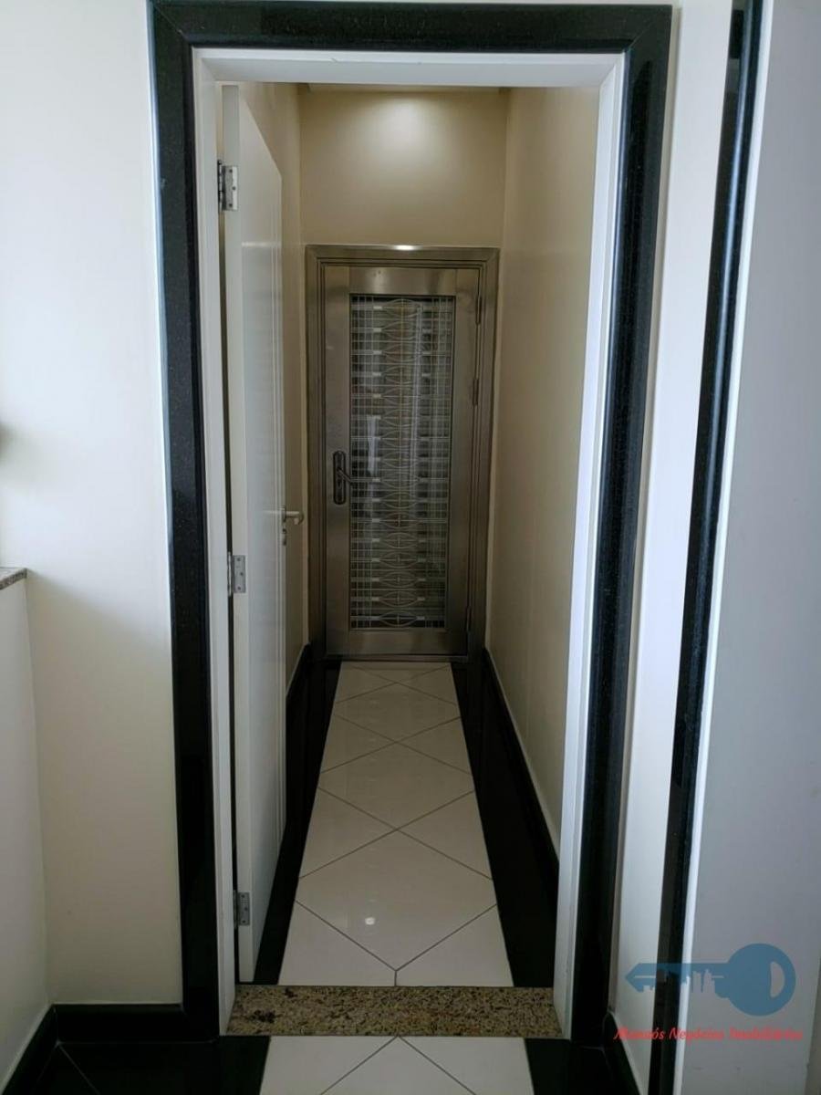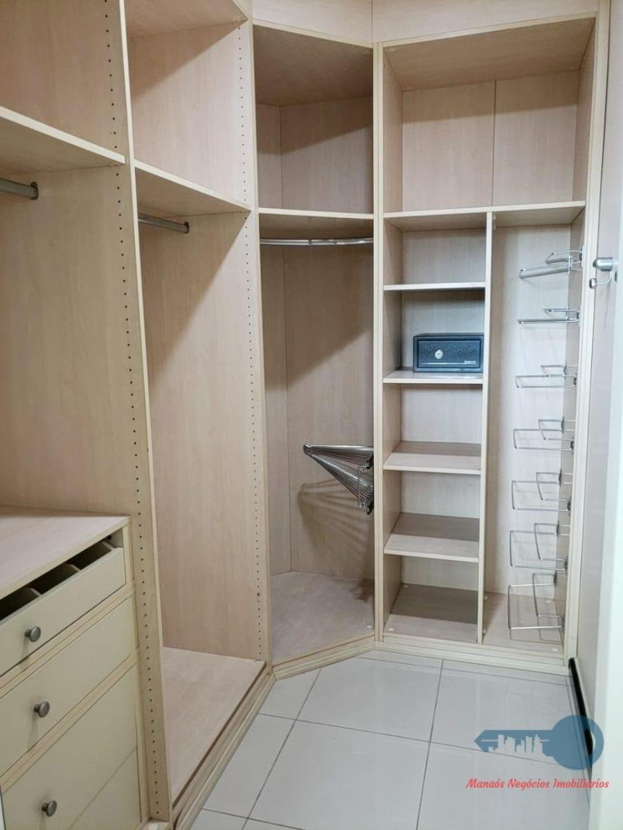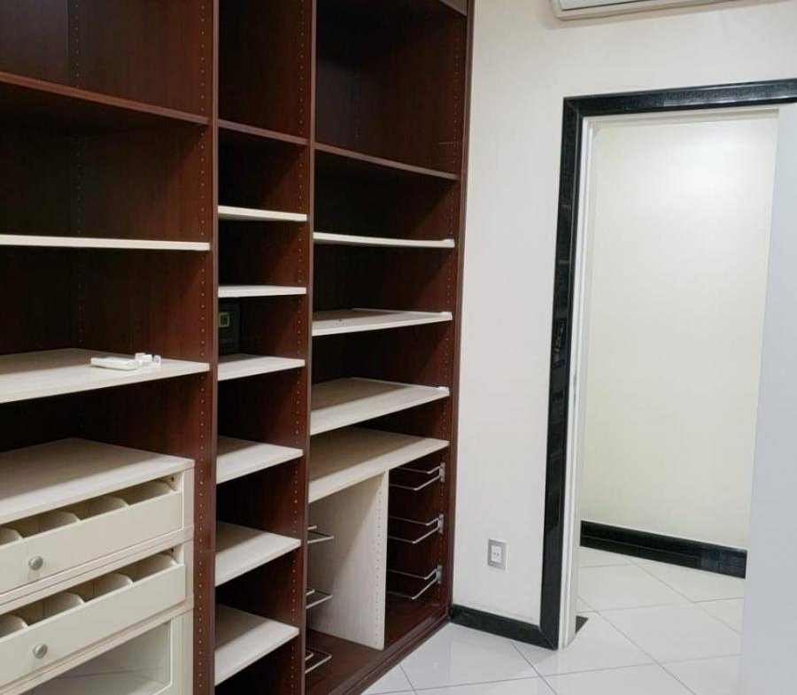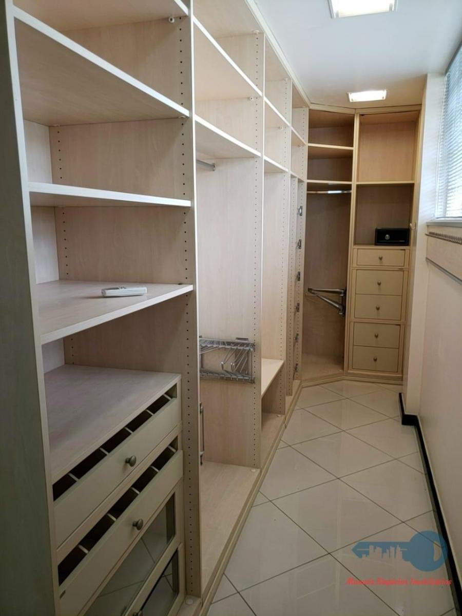 A suíte master com porta blindada e dois closeds.