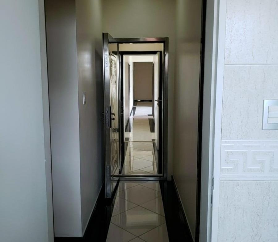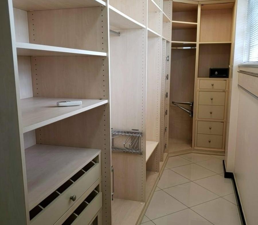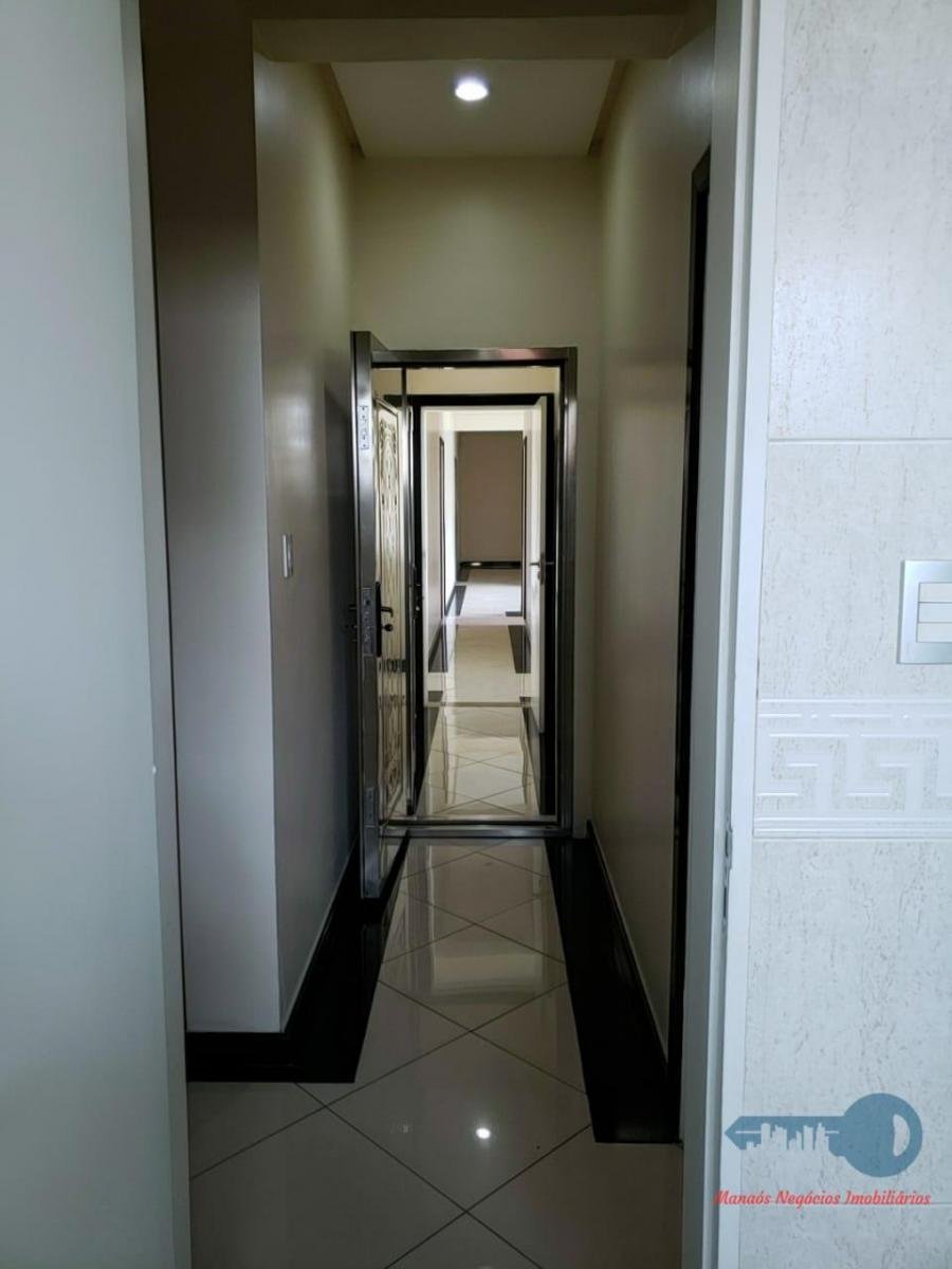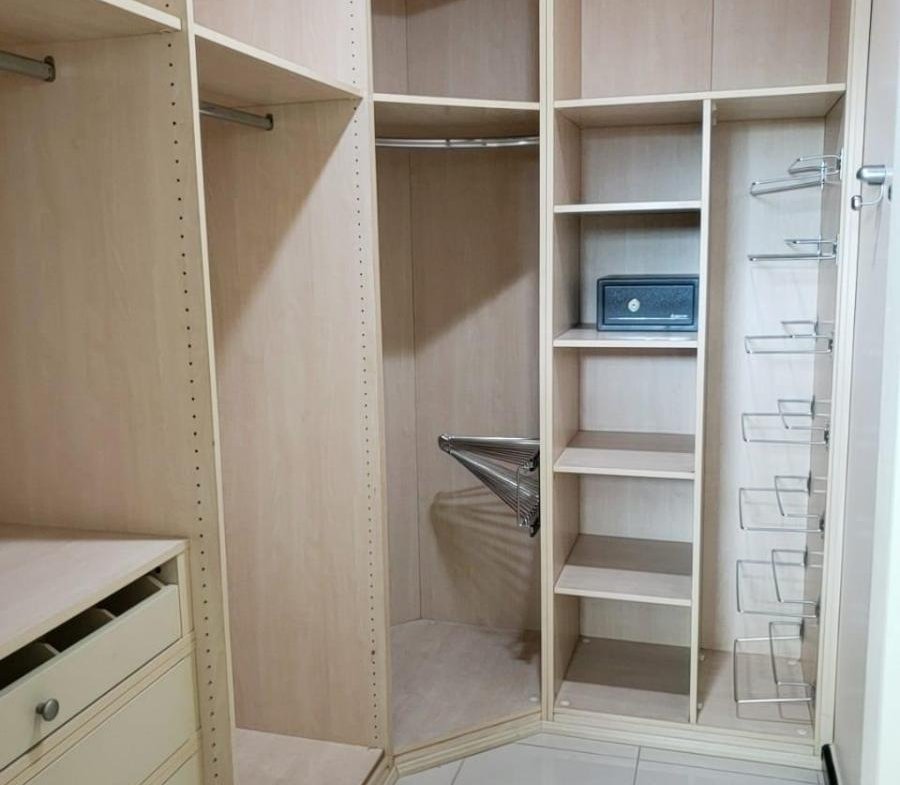 A suíte master com porta blindada e dois closeds.