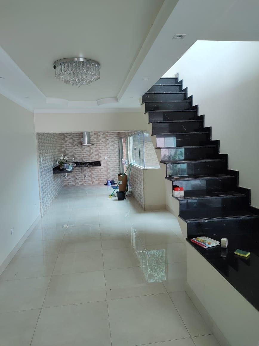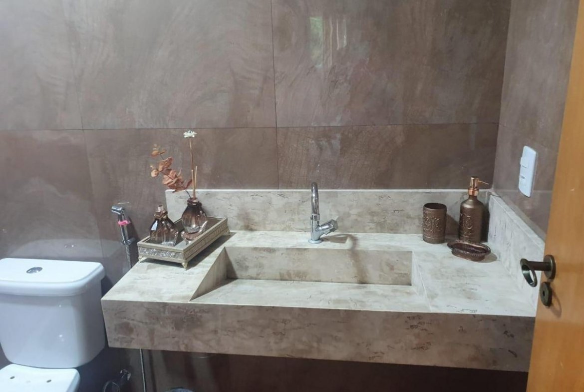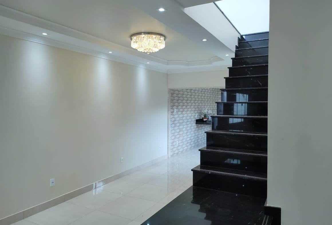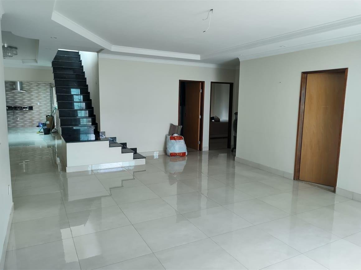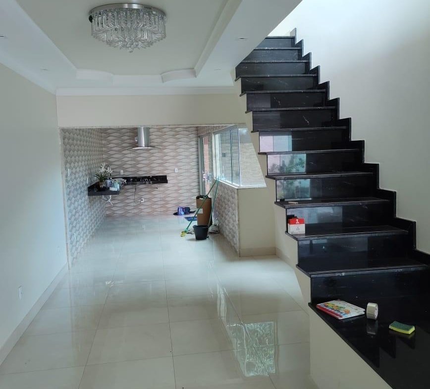 Sobrado de 275 m² de terreno e 230 m² de construção, 3 quartos sendo 1 suíte plena no 1⁰ pavimento com uma sala ampla e 2 quartos 2⁰ pavimento com outra sala menor toda no porcelanato(total de 5 quartos). 4 banheiros sendo 2 com Bancada de banheiro com cuba esculpida e Mármore Bege Bahia. Cozinha com coifa e fogão. Pedra da bancada cozinha e escada e o Preto Via Láctea. Laminação projetada. 4 vagas de garagem.