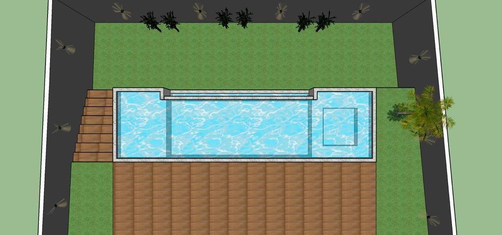 Piscina com prainha, borda infinita e ofurô, com iluminação