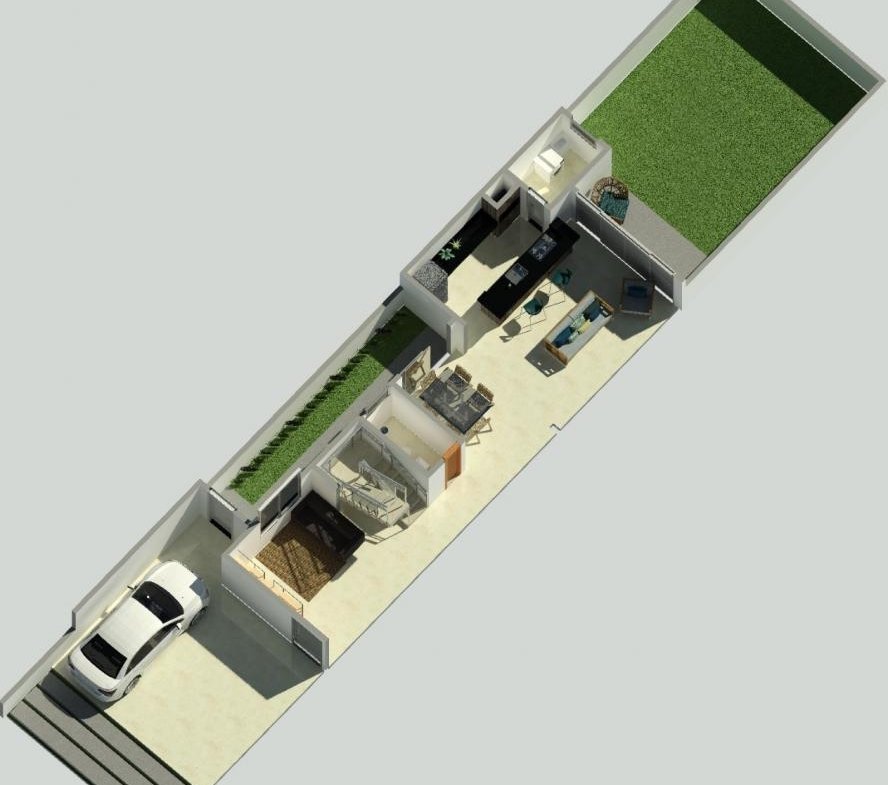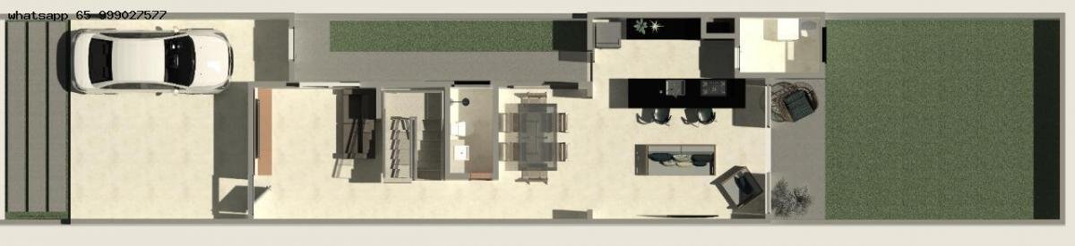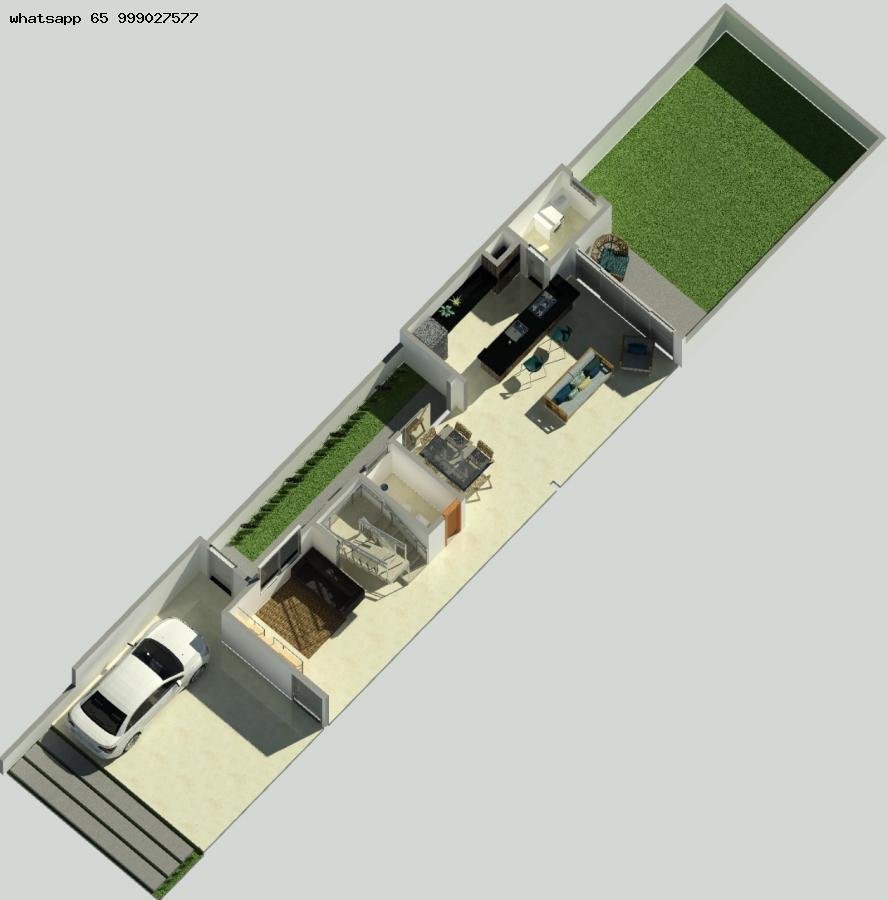 Cômodos: Cozinha, Área de Serviço, Banheiro, Corredor Lateral, Garagem, Sala.
