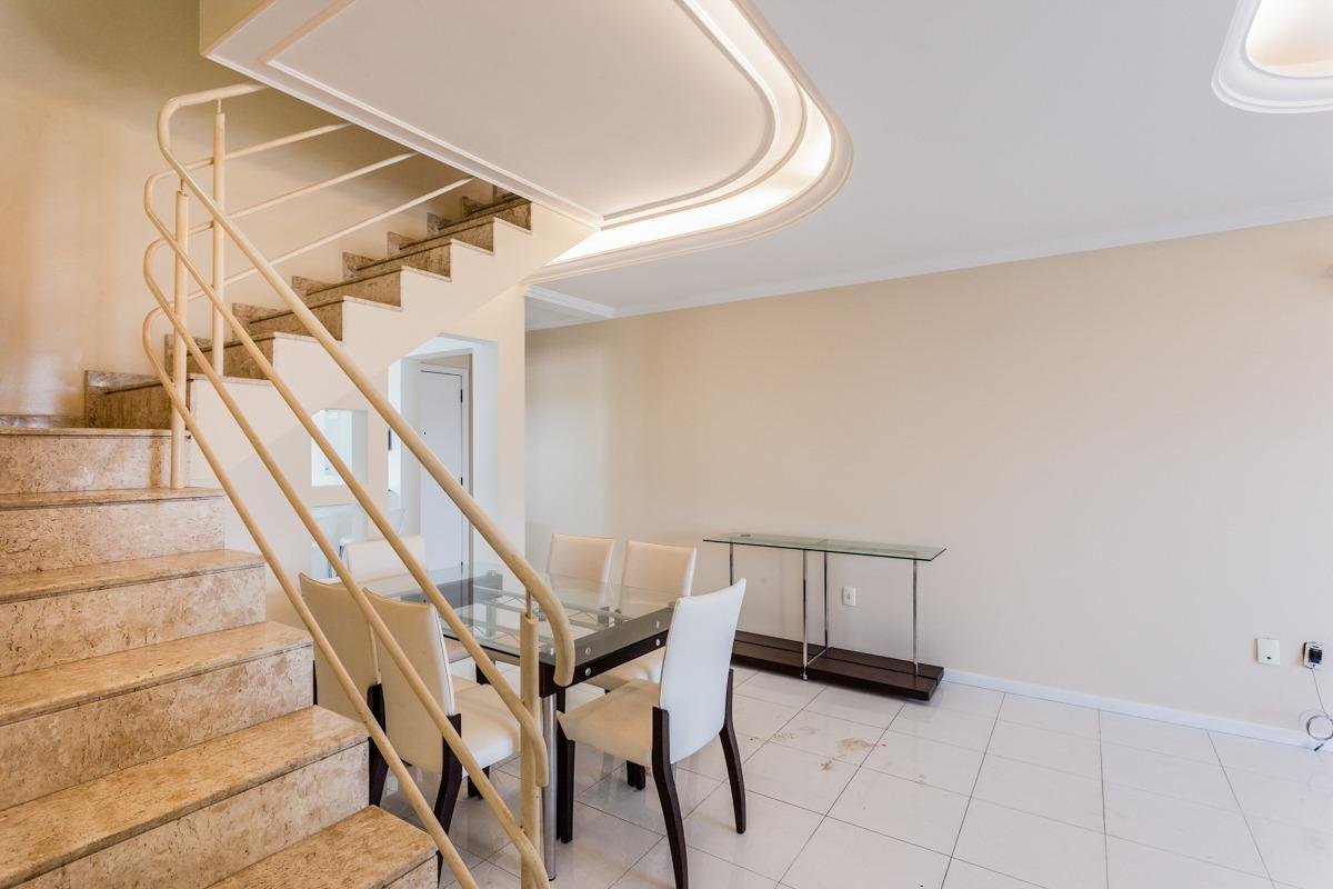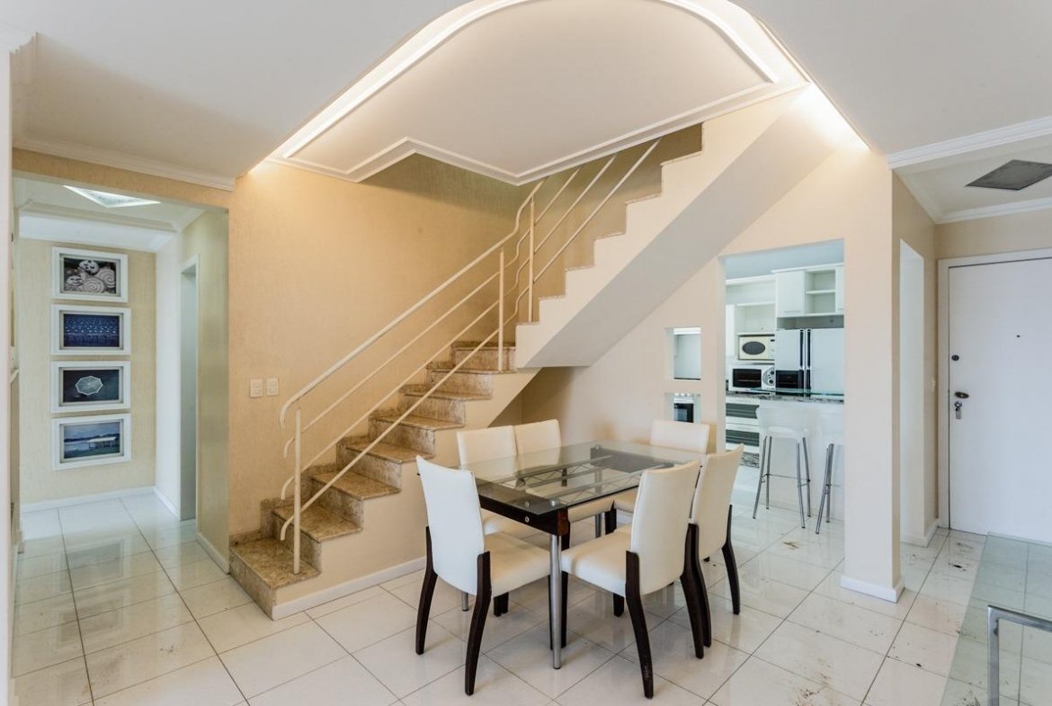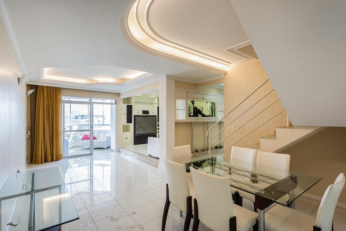 Cobertura duplex com 3 dormitórios, sendo 2 suítes, 1 das suítes sendo master com closet e hidromassagem, sala de jantar, água quente, ar condicionado, área de serviço, moveis planejados, banheiro social, cozinha americana, dependência de empregada com banheiro auxiliar, despensa, entrada para ar split, estar intimo, lavabo, terraço com churrasqueira, semi-mobiliado, vista panorâmica e vista para o mar, piso porcelanato e laminado, aquecimento de água elétrico, 2 vagas de garagem e hobby box.